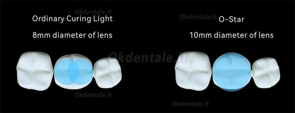 Emissione luminosa più focalizzata grazie all'angolo di luce di soli 15,8°. Garantire un buon effetto di polimerizzazione profonda. L'intensità della luce della lampada fotopolimerizzatrice sarà ridotta all'aumentare della distanza di fotopolimerizzazione. Rispetto ad altre lampade fotopolimerizzatrici, O-STAR subisce una minore perdita di luce..